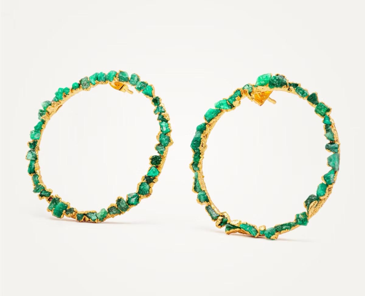 Joya exclusiva de FUSIÓN Collection, maxi topo con esmeraldas naturales en bruto incrustadas y fabricada en Bronce con enchapado en Oro de 24 k. Todas nuestras piezas son libres de níquel.